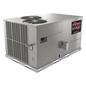 Ruud RGEDZT120ACF222AAAA0 10 ton packaged gas electric medium commercial unit. Tier 1 (commercial Classic Series), 3 phase/208-230V/60Hz, belt drive - VFD low. Heat capacity of 225K BTU with 2 stage configuration. Non-communicating.